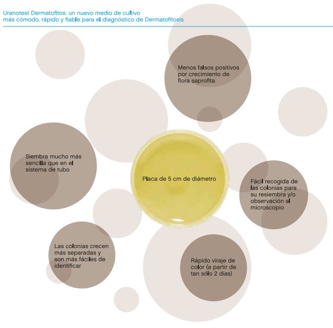 A diferencia de otros test de Dermatofitos tipo tubo, Uranotest® Dermatofitos tiene forma de placa lo que facilita el proceso de siembra de la muestra, y permite que las colonias crezcan sin superposición de unas con otras, lo que hace más fácil su visualización. De esta forma, se facilita la identificación y permite una fácil toma de muestras de las colonias con una cinta adhesiva para su resiembra u observación al microscopio.