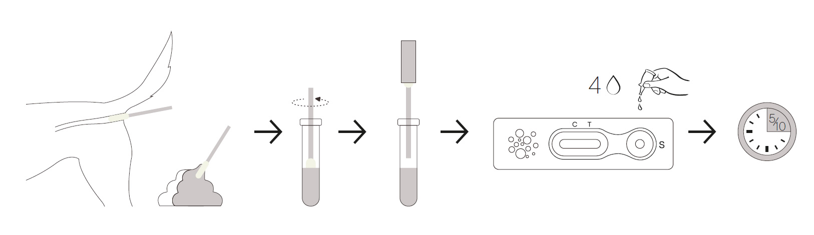 Se introduce el hisopo que se suministra en el ano, intentando recoger los restos de heces que siempre se encuentran adheridos a sus paredes. Una pequeña cantidad basta para realizar la determinación.
